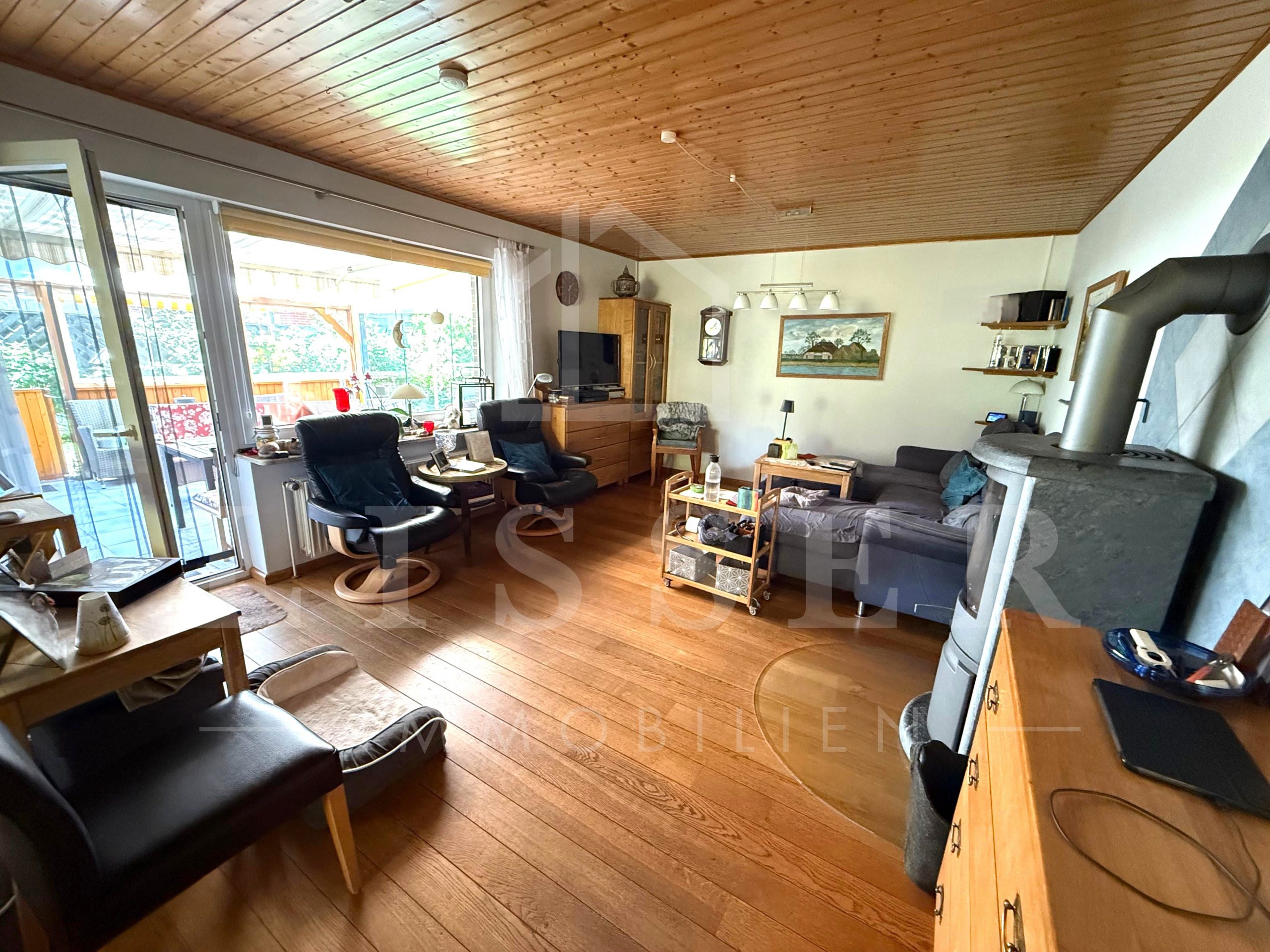 Der großzügige Wohn- und Essbereich bildet das Herzstück des Hauses. Von hier aus gelangt man direkt auf die große, überdachte Terrasse, die den Wohnraum harmonisch nach außen erweitert und zu entspannten Stunden im Freien einlädt. Der Blick öffnet sich dabei in Richtung Garten und weiter auf die angrenzende Naturschutzwiese.